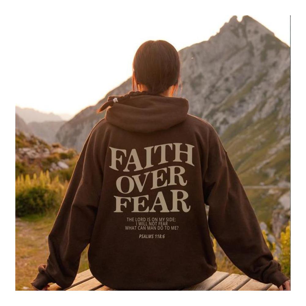 Feature: Faith Over Fear Christian hoodie top, Religion sayings Insirational sweatshirt, drop shoulder trendy Christian top, drawstring hoodies casual long sleeve top.