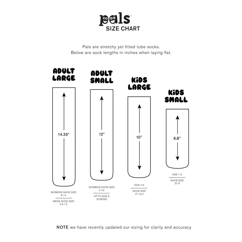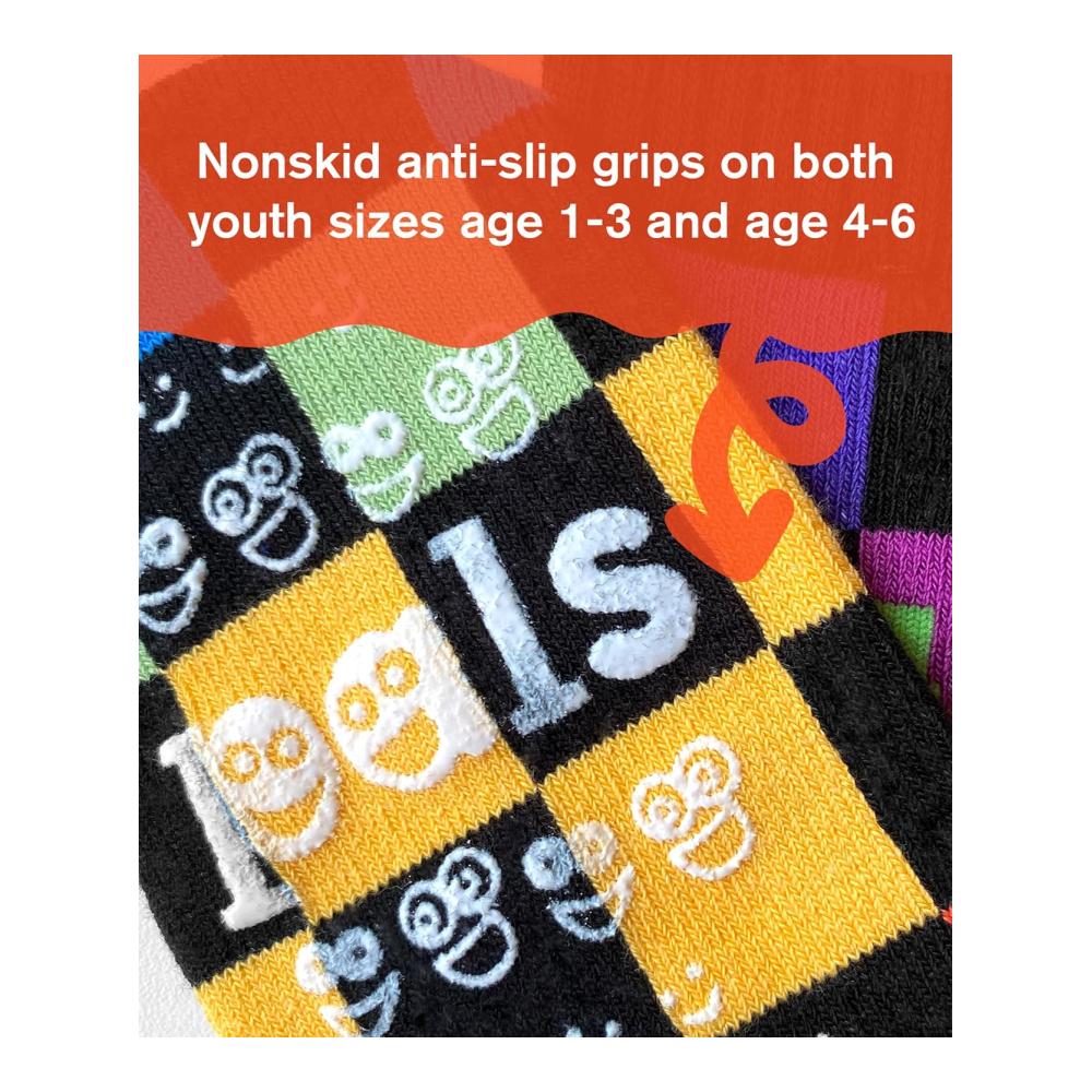 Fun Non-Slip Socks for Kids – Pals crew-length tube socks are unisex for boys and girls AND they have non-skid grips on the bottom! Choose from two sizes: Kids Small (1-3T) or Kids Large (4-6 Years).