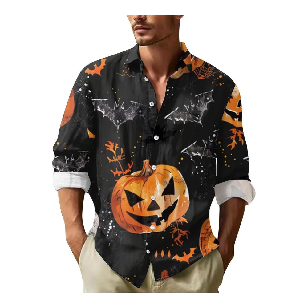 Herren-Halloween-Kürbiskopf-T-Shirt bedrucktes Langarm-Hemd für Herbst Casual-Button-Down-Tops Urlaubs-Kostüm