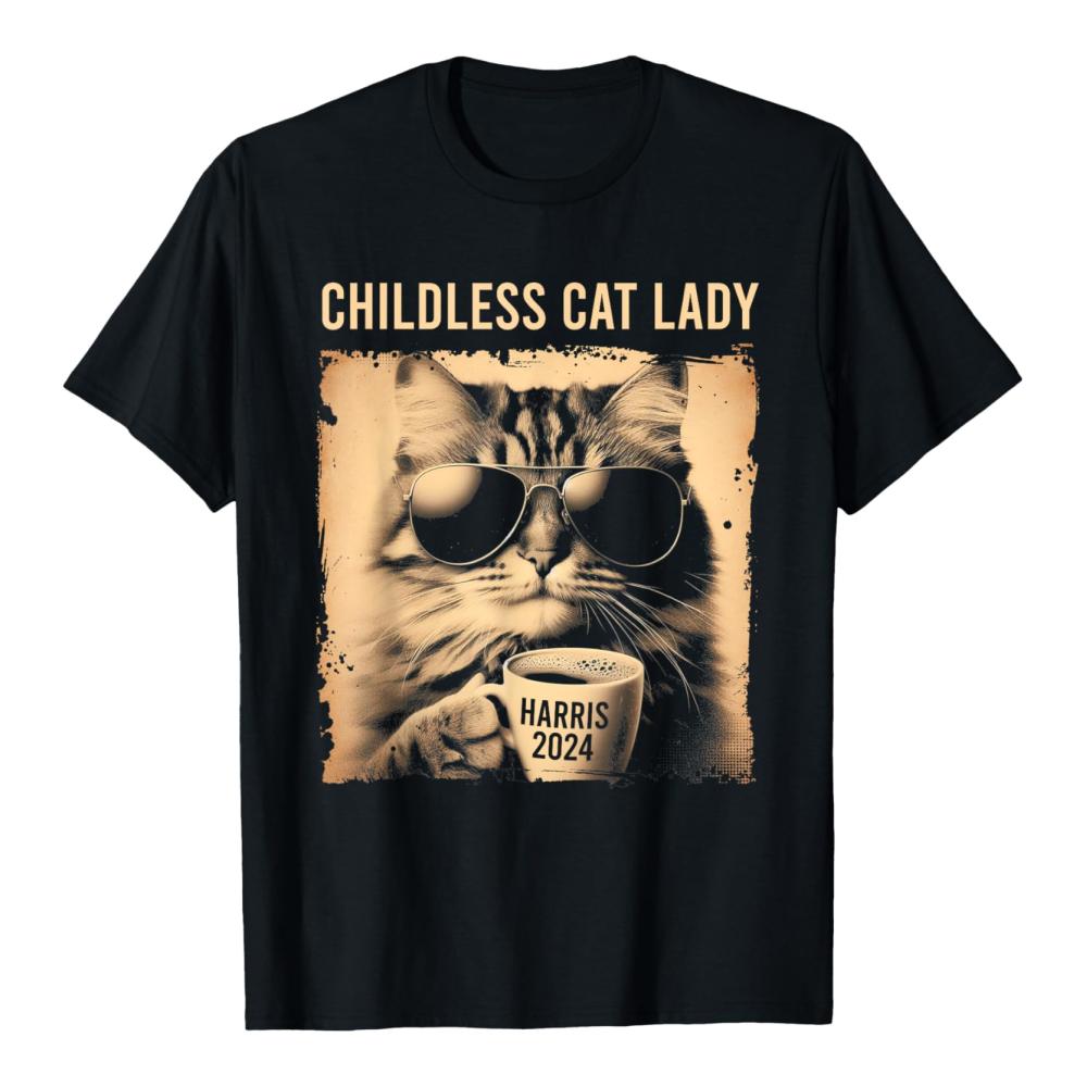 Frauen T-Shirt Katzenliebhaberin Kaffee Katze Kamala 2024 Geschenk für Katzenmama Childless Cat Lady Vintage